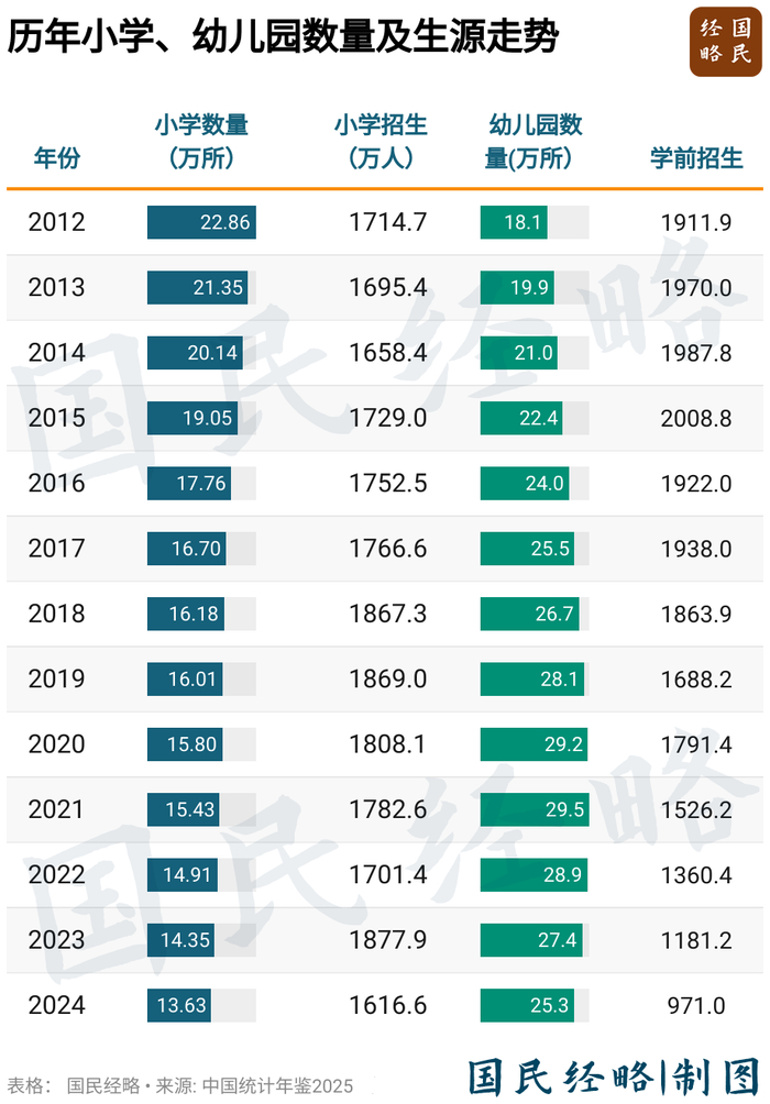 过去一年,全国幼儿园少了2万多所,小学也减少了7000多所,初中减少200多所。