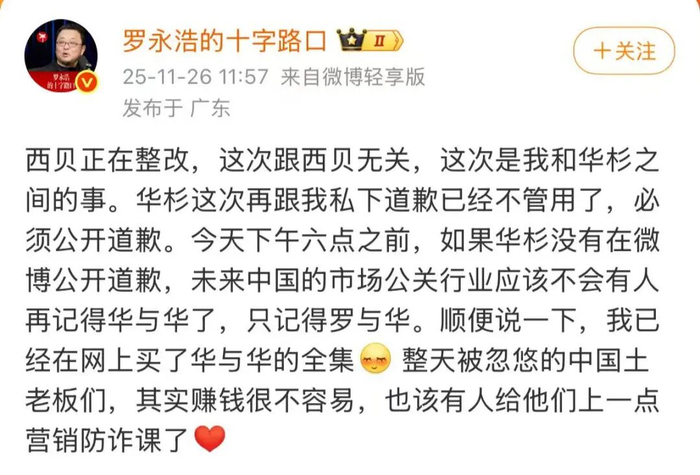 11月26日中午,罗永浩在个人微博置顶发言,要求华杉公开道歉。