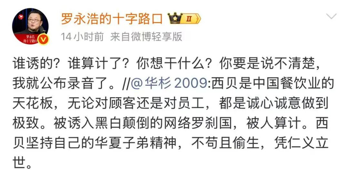 发文称“西贝被算计”。26日凌晨,罗永浩转发该微博并连发三问,引发网友围观。